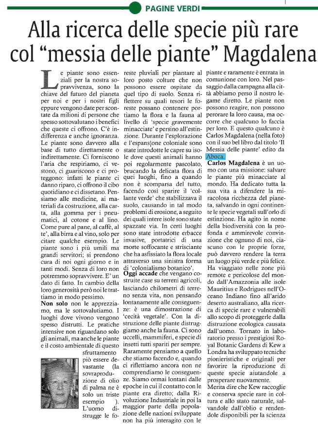 Telmo Pievani“Carlos Magdalena è un fiume in piena! Ha salvato piante rare, a rischio di estinzione o dichiarate estinte, come la Ramosmania rodriguesii, considerata sino a pochi anni fa un ‘morto vivente’ e che lui ha riportato in vita.”