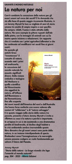 Da tempo immemorabile la natura suscita in noi curiosità, stupore, e ispira alcuni dei nostri più profondi impulsi creativi. Dagli artisti rupestri dell’età della pietra, che crearono immagini potentissime degli animali con cui condividevano e congiuntamente costituivano il mondo naturale, ai primi agricoltori che iniziarono a coltivare la terra e ad addomesticare gli animali per il consumo umano, creando nuove distinzioni e relazioni; dagli antichi Greci che “inventarono” il concetto di natura perché furono i primi ad analizzarla, all’effetto che nel Medioevo ebbe la fede in Dio sulla concezione dei diritti umani e delle nostre responsabilità nei confronti del mondo naturale; dalla rivoluzione scientifica del Rinascimento che ci portò a oggettivare la natura e quindi a distanziarcene, oltre a darci il potere di sfruttarla e trasformarla, all’influsso dell’Illuminismo e del Romanticismo, fino alla scoperta dei nuovi mondi dell’America del nord e dell’Australia che hanno forse conferito una nuova valenza alle nozioni di “wilderness” e di “natura selvaggia”. In questo libro splendidamente illustrato, Jeremy Mynott ripercorre proprio la storia della natura: passata, presente e futura. Mentre in gran parte del mondo stiamo ormai assistendo al suo rapido impoverimento, alla sua distruzione addirittura, mentre stiamo per raggiungere l’apice della crisi ambientale, questo studio fondamentale dimostra che gli esseri umani sono parte della natura, come una specie tra le altre, in un insieme interdipendente, rivelandoci come l’immaginazione e la meraviglia umane possano svolgere un ruolo rigeneratore per spiegarci, in ultima analisi, cosa la natura significhi per noi.