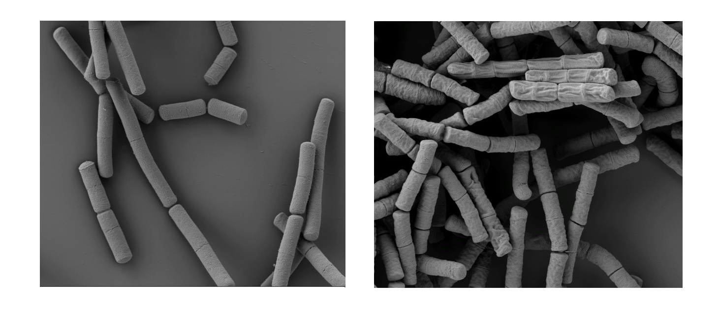 Nell’immagine 1, Cellule di Bacillus anthracis non trattate; nell’immagine 2, Cellule di Bacillus anthracis trattate con Nanobodies anti “armatura proteica, S-layer.