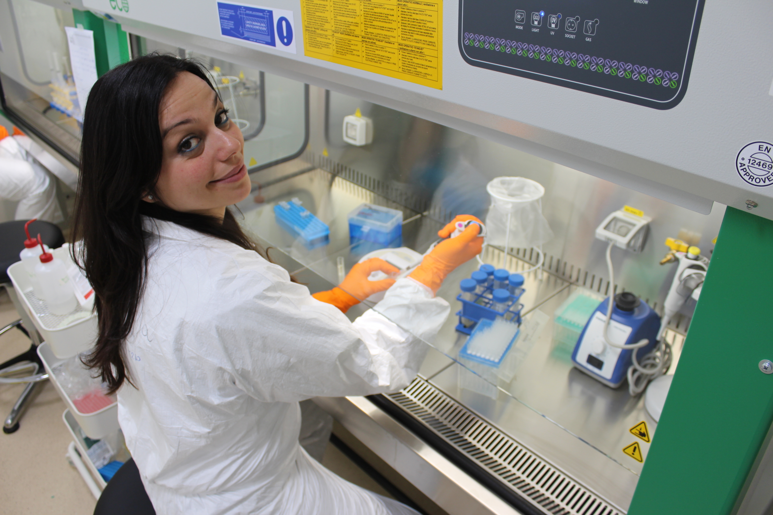 Il laboratorio è il mio posto felice. Lavorando con i patogeni, è un laboratorio a pressione negativa e l’abbigliamento è un po’ scomodo perché ho un mega–tutone da capo a piedi, tipo SuperMario. Tante volte non vedi il sole, però è proprio un posto di pace, anche se ho a che fare con i cattivi. È un posto dove c’è ordine, perché l’ordine ti aiuta a proteggerti e se sbagli una procedura ti metti a rischio, metti a rischio gli altri. Al microscopio potrei passarci delle ore, degli anni, a guardare i miei batteri, quello che fanno, quello che faccio io a loro, poverini gliene faccio di tutti i colori e poi a modo loro si vendicano. Sono microscopi diversi, a fluorescenza o a scansione elettronica dove vedi tutto in 3D. Non finisci mai di scoprire, basta osservare. E poi però devi capire perché una certa cosa che hai visto è così.
