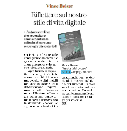 Il libro di Vince Beiser, “I metalli del potere” (Aboca, 324 pagine, 26 Euro, traduzione di Maurizio Riccucci), racconta – come recita il sottotitolo – “La corsa alle risorse che daranno forma al nostro futuro”.