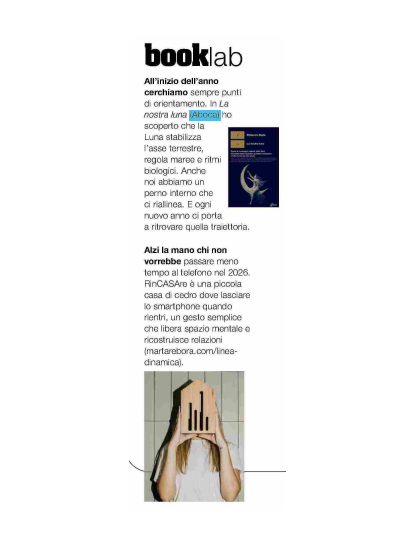 All’inizio dell’anno cerchiamo sempre punti di orientamento. In La nostra luna (Aboca) ho scoperto che la Luna stabilizza l’asse terrestre, regola maree e ritmi biologici. Anche noi abbiamo un perno interno ché ci riallinea. E ogni nuovo anno ci porta a ritrovare quella traiettoria.