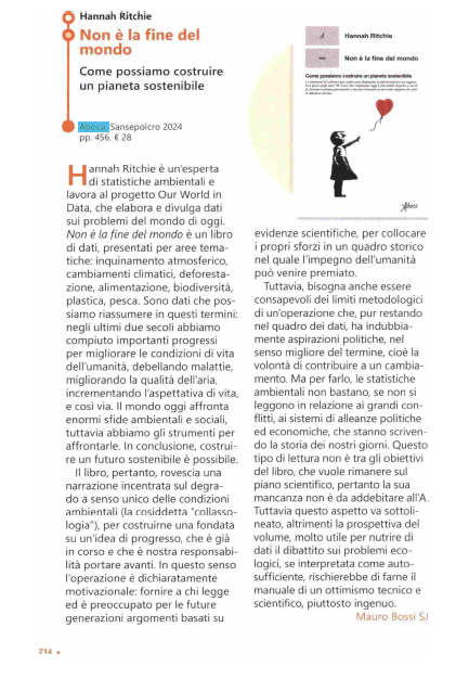 Hannah Ritchie è un’esperta di statistiche ambientali e lavora al progetto Our World in Data, che elabora e divulga dati sui problemi del mondo di oggi. Non è la fine dei mondo è un libro di dati, presentati per aree tematiche: inquinamento atmosferico, cambiamenti climatici, deforestazione, alimentazione, biodiversità, plastica, pesca. Sono dati che possiamo riassumere in questi termini: negli ultimi due secoli abbiamo compiuto importanti progressi per migliorare le condizioni di vita dell’umanità, debellando malattie, migliorando la qualità dell’aria, incrementando l’aspettativa di vita, e così via.